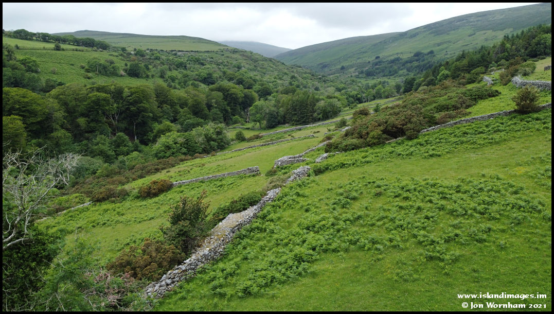 Last conventional picture, looking over the stone walls from a low height with a cloud capped Snaefell in the distance. Some interactive 360 degree panoramas follow.