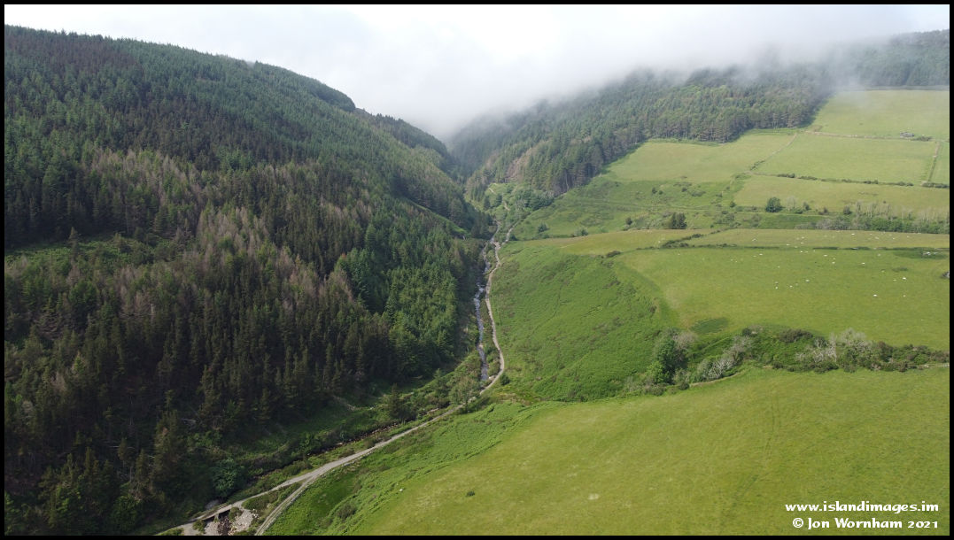 Looking down the valley towards Glen Maye with the sea fog drifting up. The wooded area on the left was the site of the extensive Glen Rushen Slate Quarry, although most of the remains are now hidden in the trees.