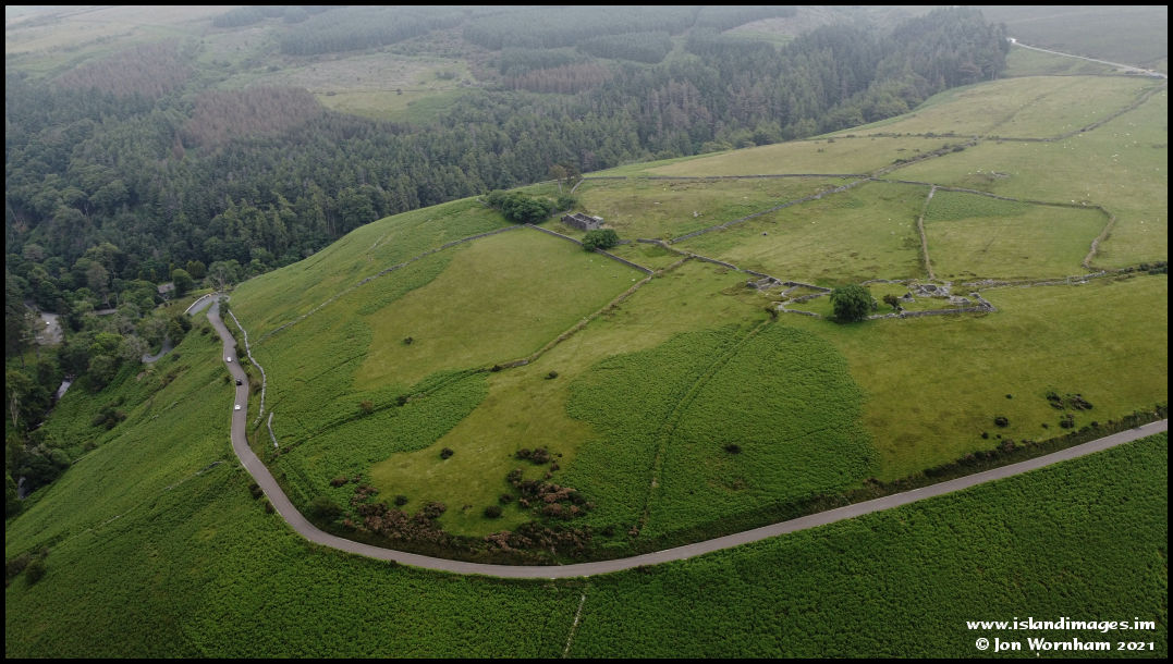 Looking across to the far side of the valley as the road winds down towards Tholt-y-Will with the tholtans of The Corrody and The Creggans on the hillside above.