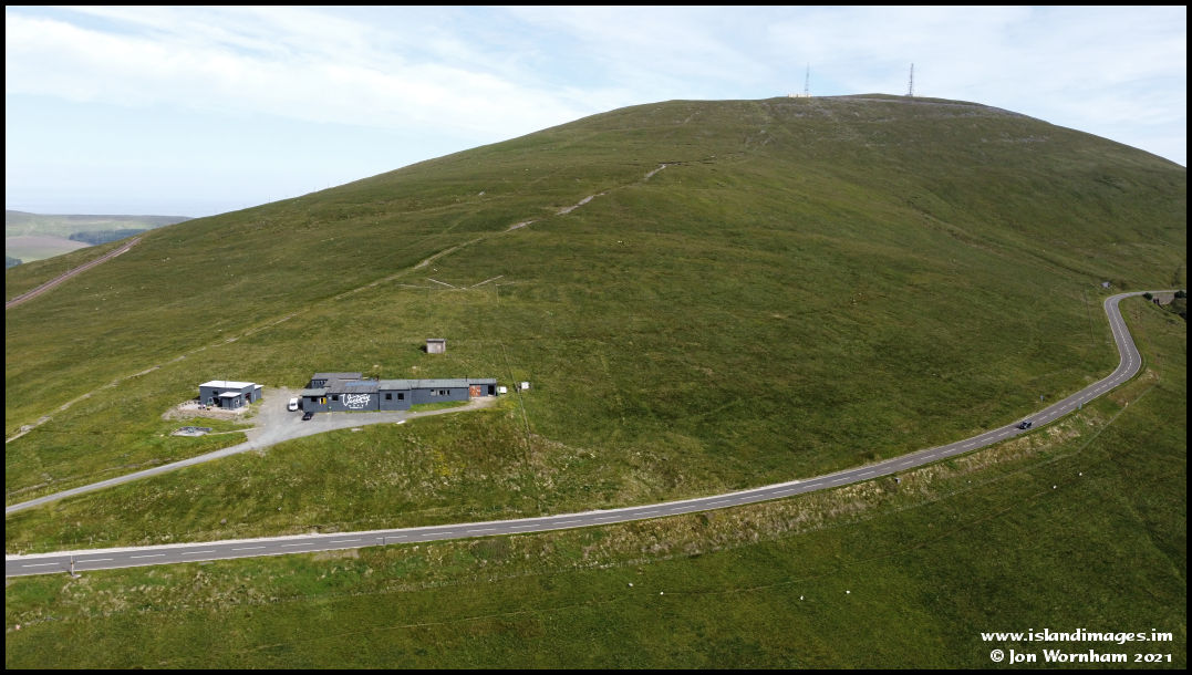 Looking past the Victory Cafe to the summit of Snaefell, around 600 ft above. Snaefell is looking very green at the moment, as a contrast to the browns