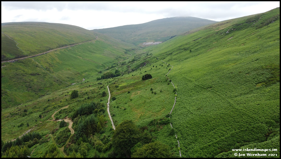 Looking along the track towards Snaefell, where cloud has now hidden the radio masts. The hillsides are covered with bracken, which is giving the bright green colouring.