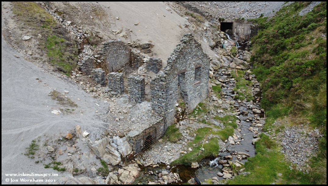 Dropping the drone right down into the little valley to take a closer look at the old building, with a barred off mine adit entrance next to it. The stream runs through a tunnel under the mine, just behind.