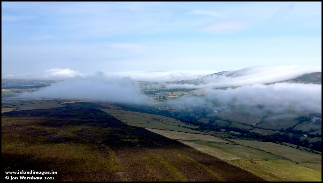 Just airborne over Slieau Ree, near Keppel Gate, and looking down the East Baldwin Valley as low cloud drifts down the hills. In the distance the central valley looks to be full of fog.