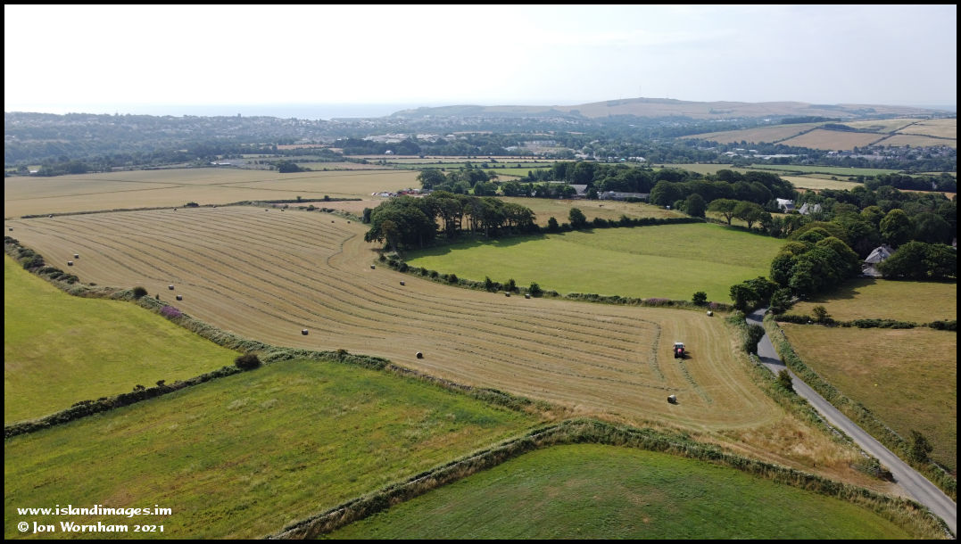 It may be foggy in the valleys, but it's clear sunshine looking towards Douglas and the farmer at Mount Rule is making up hay bales from a recently harvested field. Mount Rule airstrip can be seen top left of picture.
