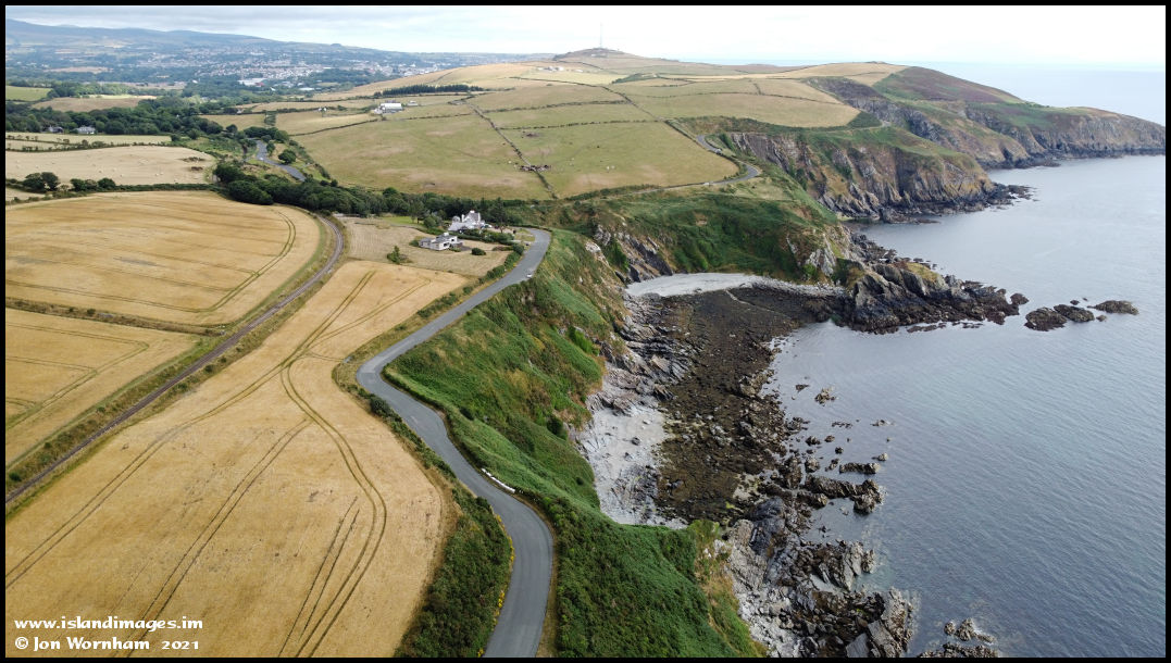 Looking along the Marine Drive to the little hamlet of Keristal. The Douglas Southern Electric Tramway ran along the road here before turning to the right just past the houses to follow the coast to Douglas.