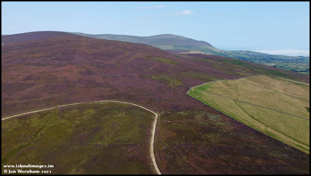 Purple clad hillsides with North Barrule in the distance. This area is called The Dreem and there is an old WW2 aircraft crash site around the centre of the picture, just above the stone wall.