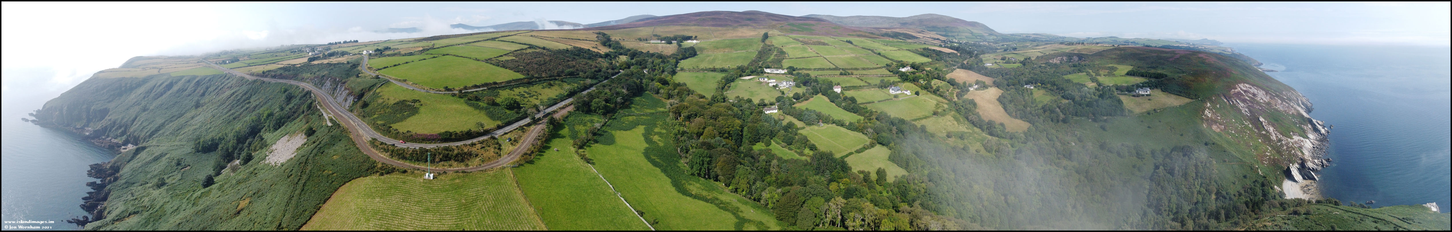 Another stitched panorama from 10 original shots, looking from Bulgham Bay with the Manx Electric Railway and coast road on their ledge, across to the land above the Dhoon Glen on the right.