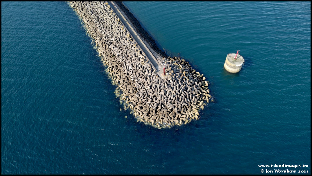 Looking down on the concrete 'stabits' that protect the breakwater, with Douglas Port radar scanner located on the end. Douglas was the first seaport in the world to be equipped with radar, in 1948.