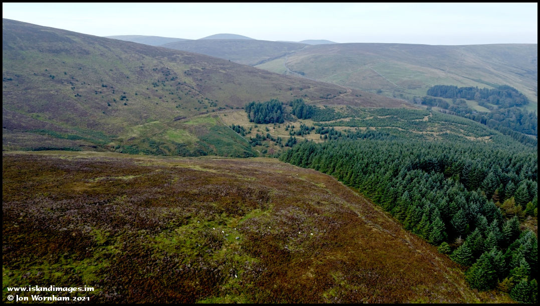 Climbing up higher for a look across into the next valley. The planation is on the right and the course of Governor Loch's Road can be seen skirting around the hillside.