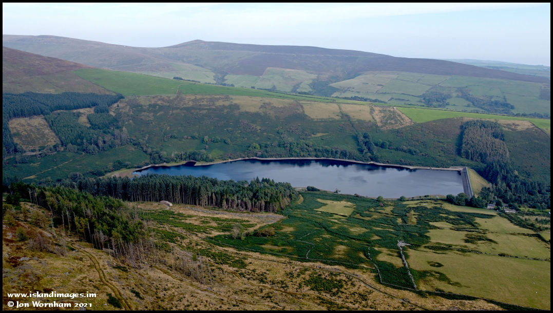 Turning the camera back to look down to Injebreck Reservoir. The dark green areas are where bracken has taken over former farm fields.