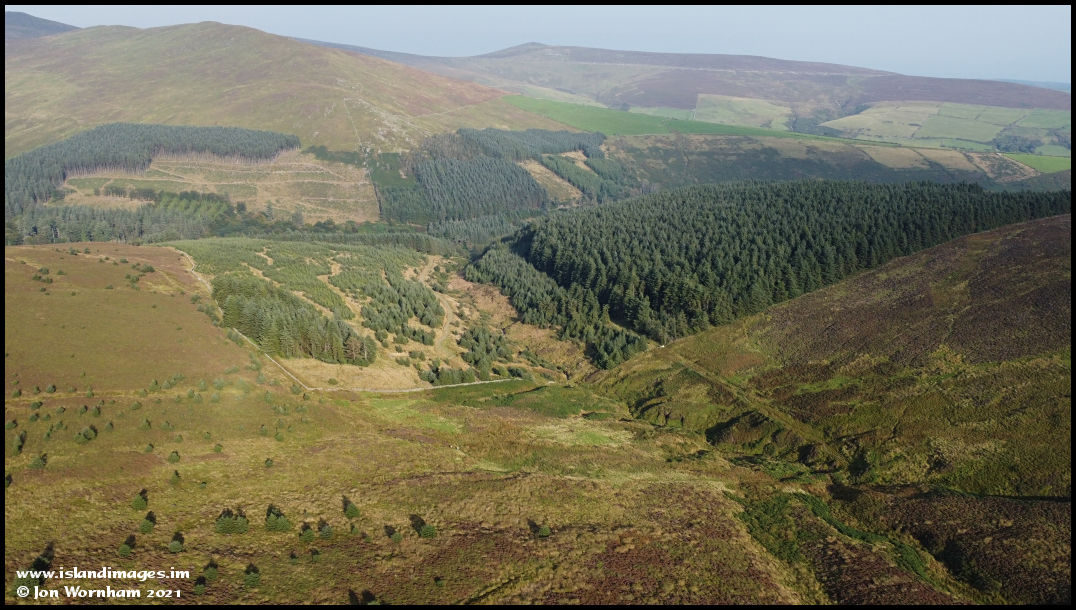 The sun has come out and I've taken the Mini 2 back into the air, looking down the Colden River Valley. Governor Loch's Road can be seen running through the plantation before emerging onto the moorland.