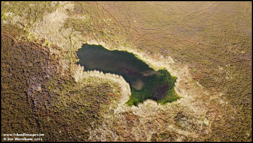 A near vertical view of the larger, more northerly, of the dubs. The tracks in the heather are made by sheep, probably coming here to drink.