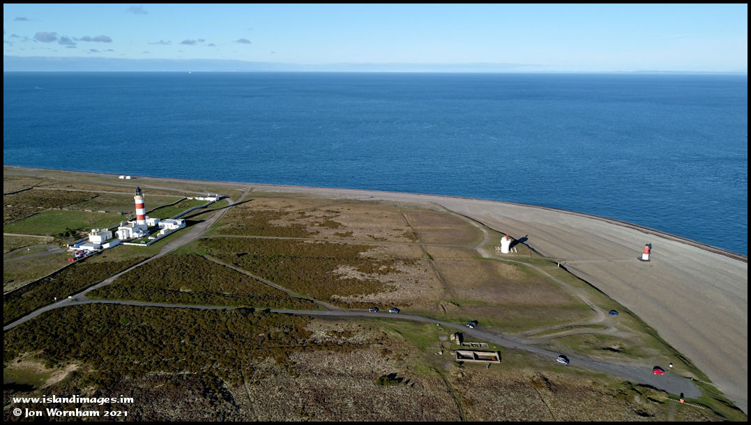 Lighthouses at the Point of Ayre. The mountains of southern Scotland are visible on the horizon to the right of the picture. The ruins in the foreground were the pumping station for the brine well that supplied the Ramsey salt works.