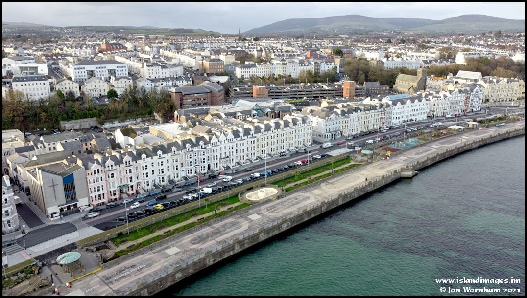 Loch Promenade and the sunken gardens. There's no water in the ornamental fountain in front of the Ellan Vannin Hotel at present.