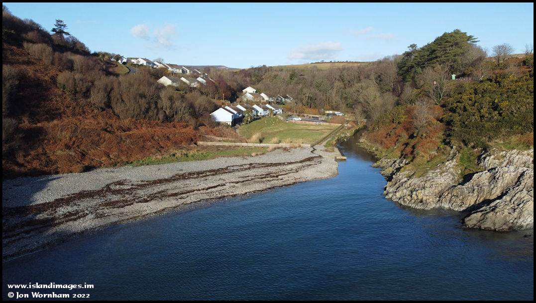 A lower level view looking along the river from over the sea. The sea colour has changed considerable from the last vertical picture as it's now reflecting the blue sky.
