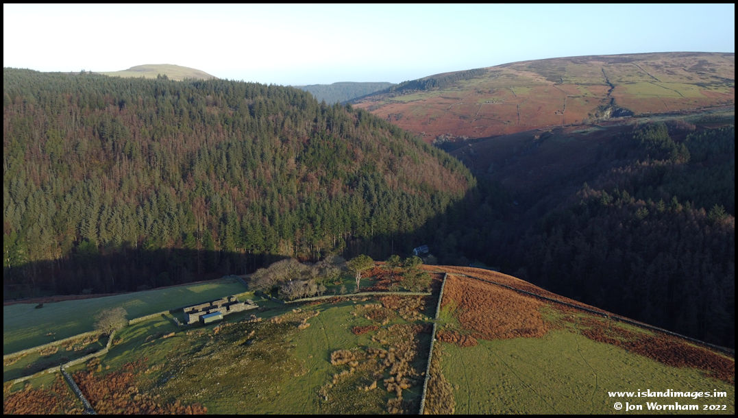 The one time big barn at The Creggans, with the farmhouse remains hiden in the trees. Down below in the valley you an see the converted chapel at Tholt-y-Will.