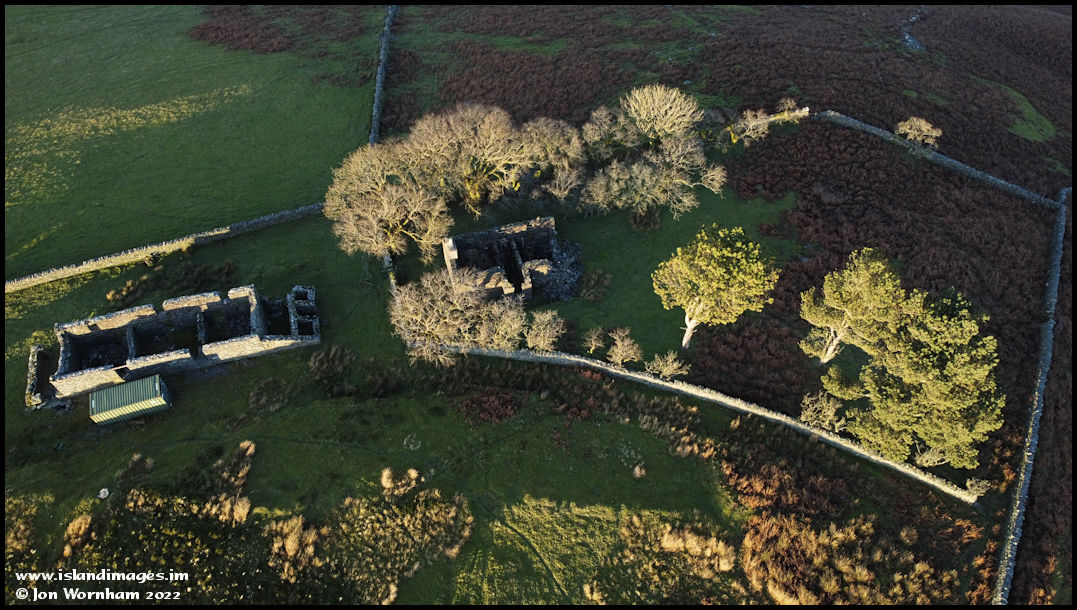 Looking vertically down on the former farmhouse at The Creggans. The wall around it would have enclosed the kitchen garden and orchard.