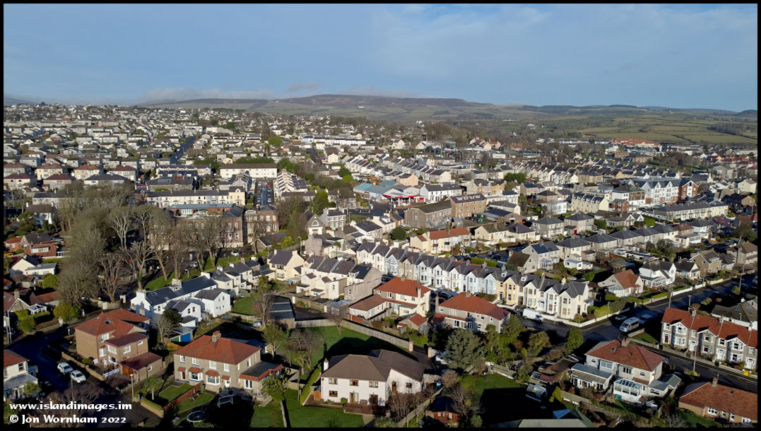 Looking across the rooftops of central Onchan, with Corkill's Garage centre shot. Up in the hills in the distance, you can see the Creg-ny-Baa and Kate's Cottage (just!)