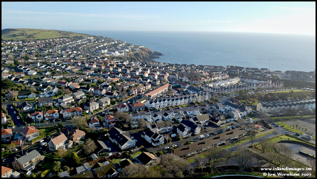 Turning the camera angle around to look across Royal Avenue and down to the sea in the area of Onchan harbour.