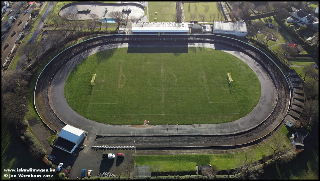 Looking almost vertically down to the Onchan Raceway. I hadn't realised before that there is a football pitch inside the course!