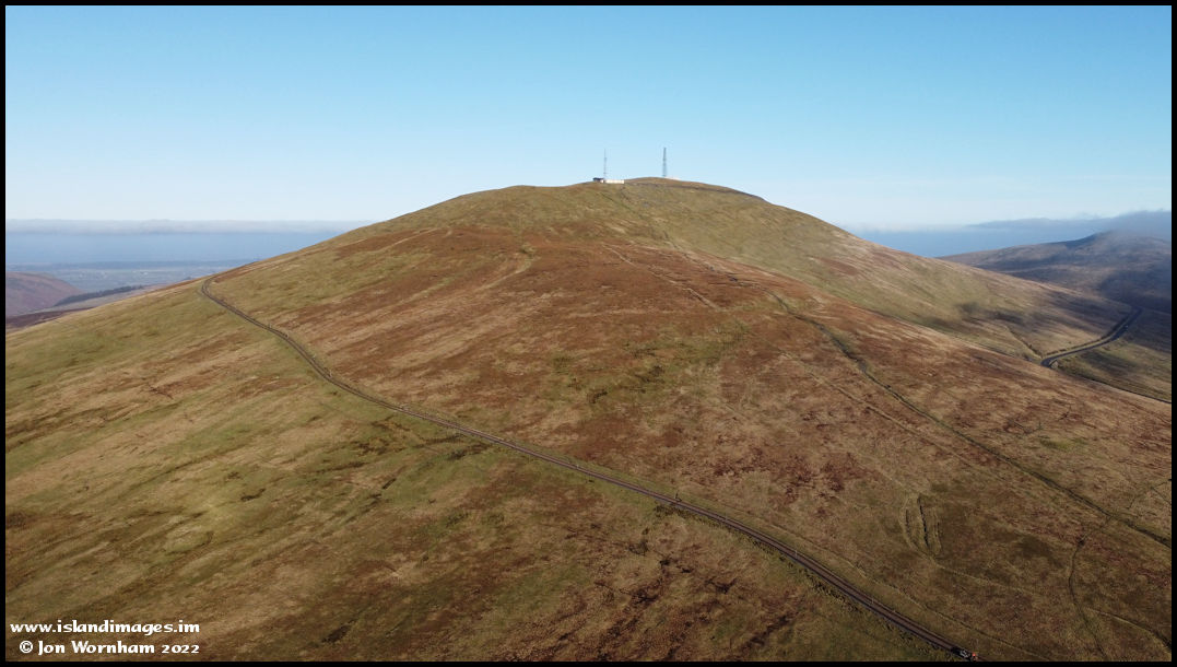 Snaefell, with the cloud all gone (for now). The mountain railway can be seen climbing its way up before circling the summit.