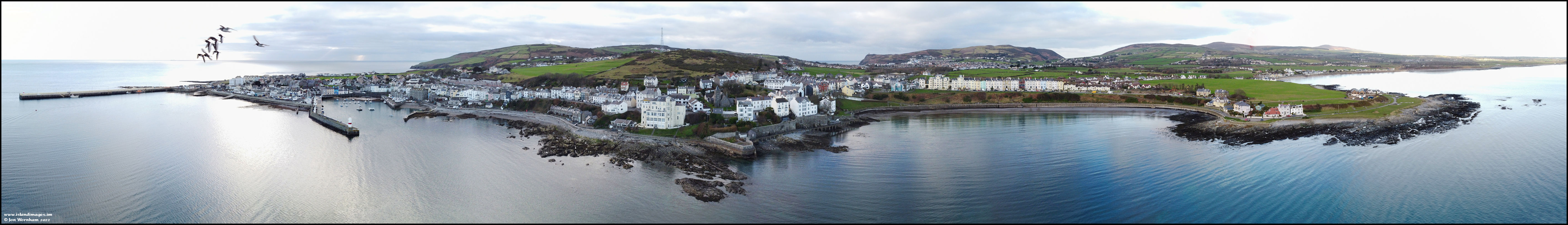 Panoarama of Port St Mary - still with Oystercatchers! Looking from the outer breakwater on the left, then past the main part of the village and Chapel Bay, ending at Gansey Point on the right.