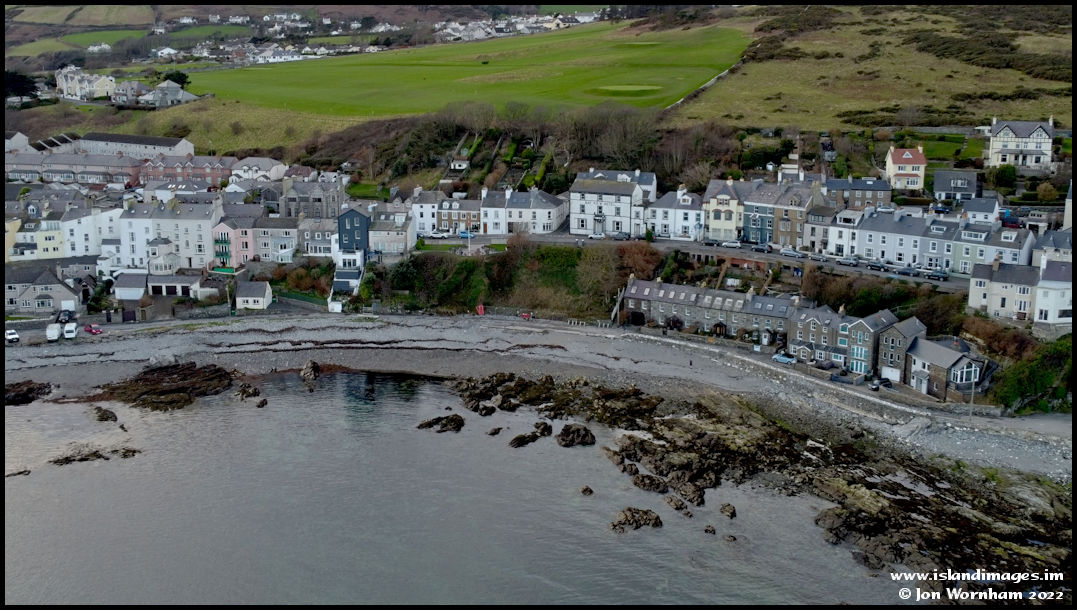 Former fishermen's cottages at the back of the stoney beach with the main road through the village elevated behind them.