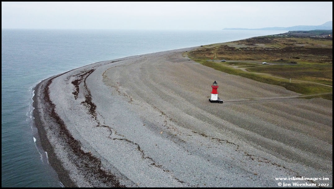 Layers of shingle banks at the Point of Ayre, with Maughold Head just visible in the distance through the haze.