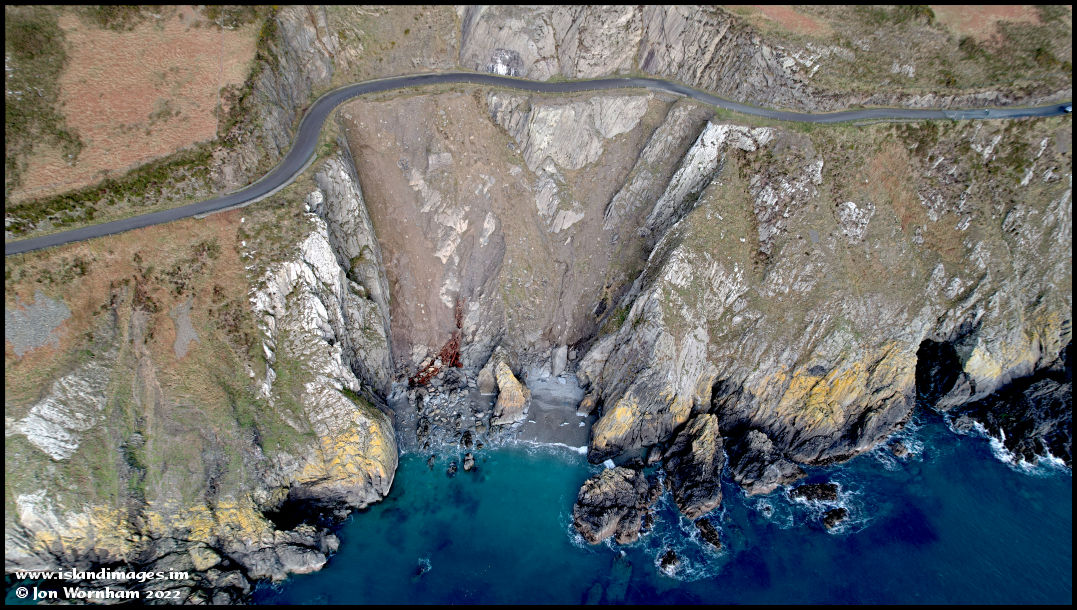 Looking down on Port Wallberry, the remains of the steel viaduct still laying at the back of the beach. The tramway closed at the outbreak of WW2 and never reopened afterwards. The roadway was widened and cut into the cliffs, between 1956 and 1963.