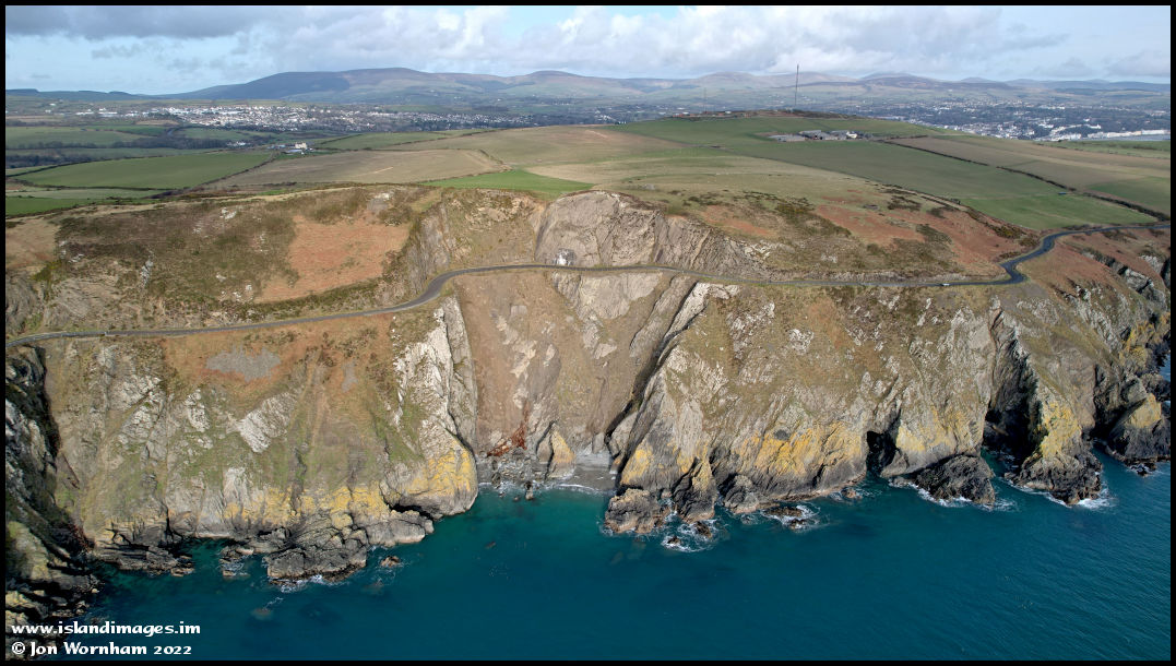 Flying out to sea and down to a lower altitude for a look back at Port Wallberry. Most of Douglas is hidden behind Carnane Hill.