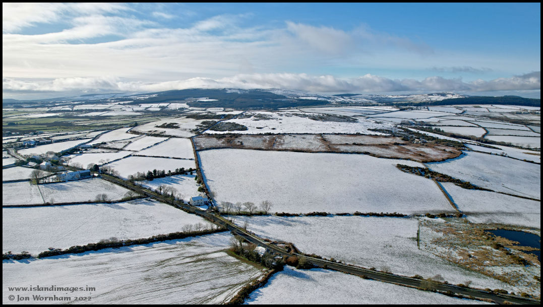 Turning the viewpoint around and looking to the low hill of Slieau Chairn which rises above the present village of Braaid. Cloud is sitting on South Barrule in the distance.