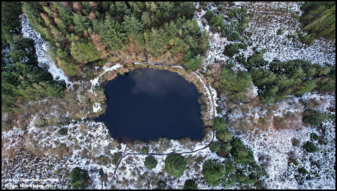 A near vertical view of the lake. Although not really apparent here there are two streams leading out, the one on the right is the River Dhoo, the one on the left falls down through Glion Darragh, eventually joining the River neb in St John's.