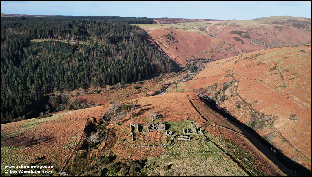 I've now walked up into the hills around 450 ft above the valley floor to find a better flying location. This view is looking over Ballaskella tholtan and back down into Sulby Glen.