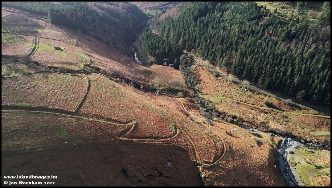 Most of these upland farms were reached by green lanes that twisted and turned across the hillsides from the valley below. This is the one up to Ballaskella from the stone bridge, the low sun angle picking it and the old field boundaries out well.