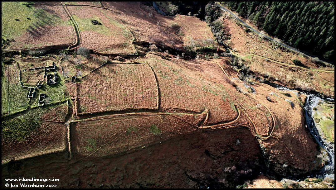 Altering the camera position to include both Ballaskella and the green lane up from the valley. Another old green lane leads away in the direction of Tholt-y-Will farm, another tholtan.
