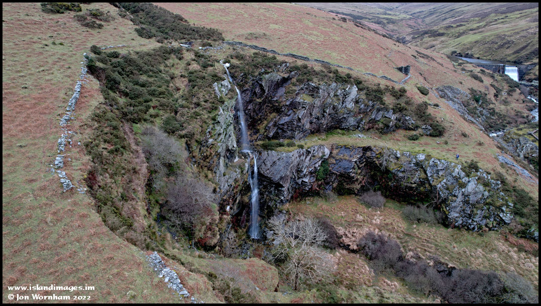 Moving over the western rim of the quarry. The two smaller waterfalls have disappeared, but the reservoir dam has come into shot.