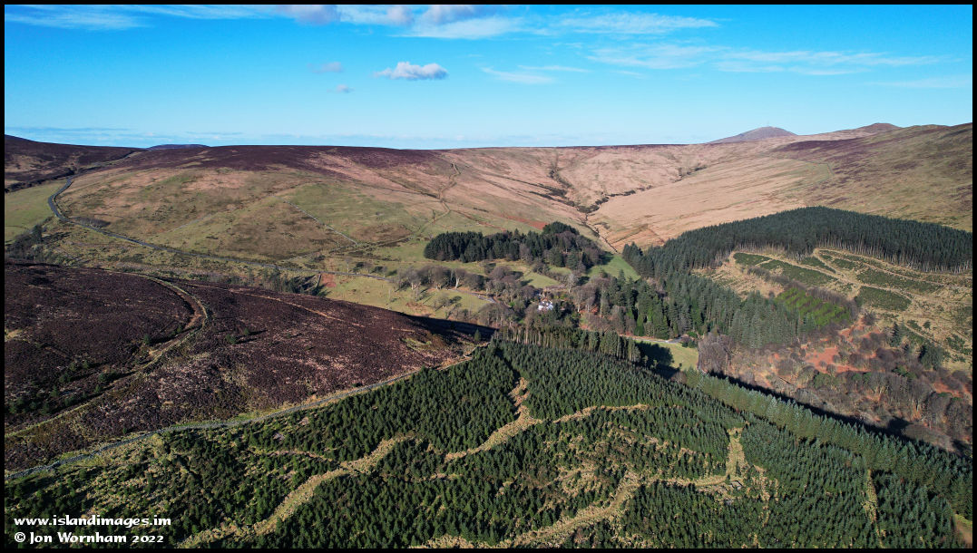 Over a fairly recently replanted area of Colden Plantation, looking across Injebreck House and to the source of the River Glass.