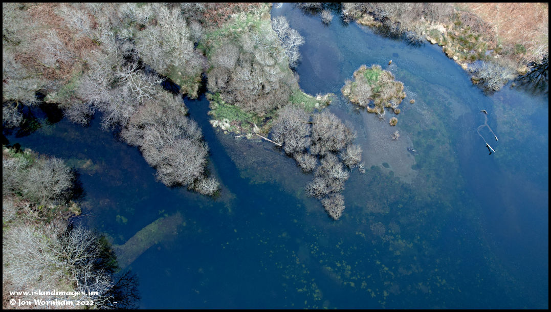 A vertical view looking down at the top end of the reservoir. The old stone bridge that only emerges when the water is low can be seen submerged at the lower left.