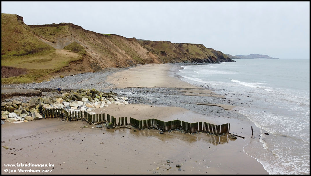 A low level look over the beach defence fence with Peel Hill in the distance.