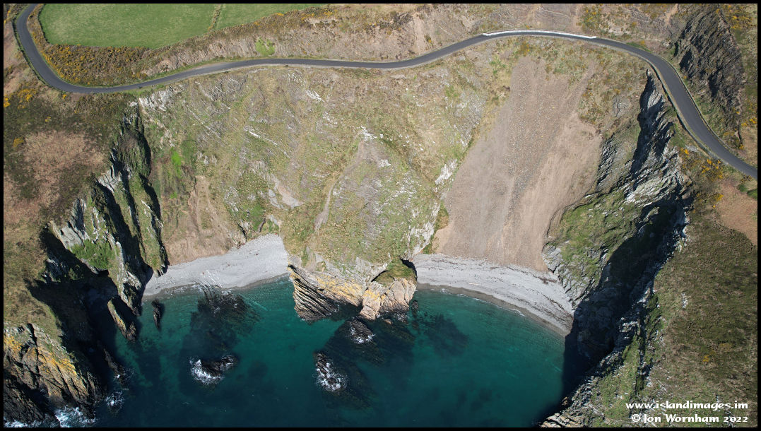 An almost vertical view of the twin beaches. Lovely sea colours.