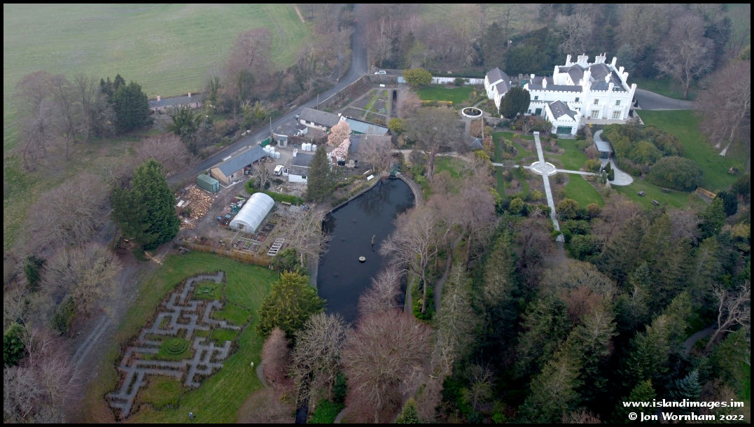 The gardens at Milntown are divided into several distinct areas. This picture was taken from overhead the wooded area, with the former millpond central. The new Isle of Man shaped maze is taking shape to the lower left of shot.