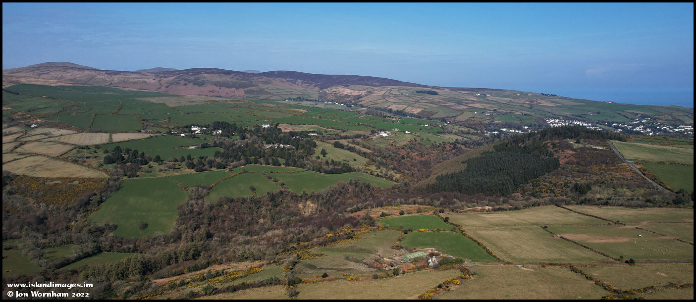 Changing the viewpoint to look down the glen towards Axnfell Plantation, with a few of the houses in Laxey just visible over the hilltop.