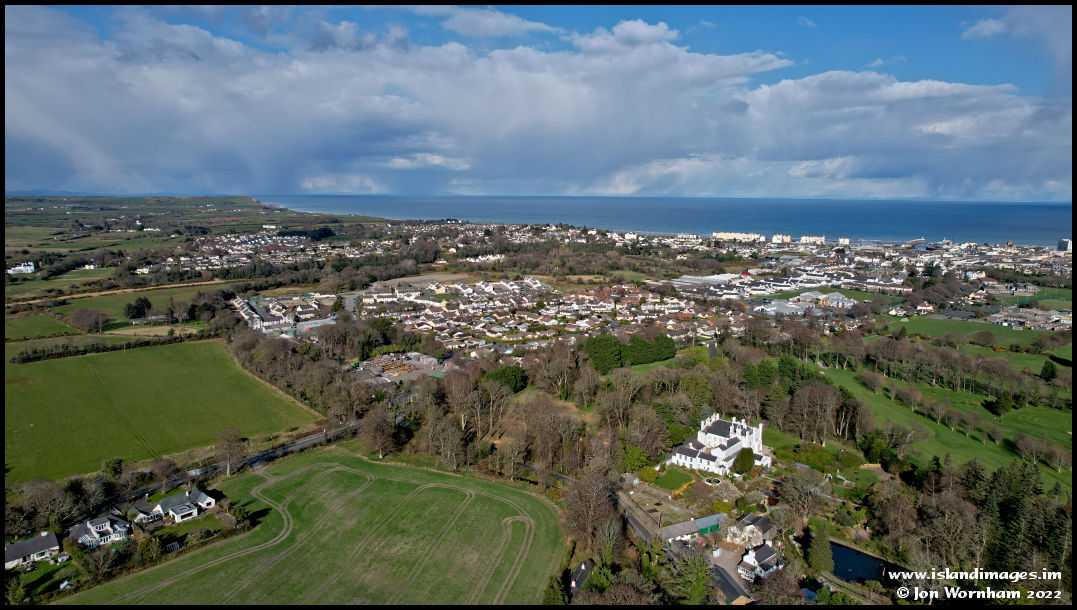 Looking across Milntown House and part of the town of Ramsey. The Cumbrian Mountain in Englad are just visible on the horizon, but partially obscured by rain and hail showers.