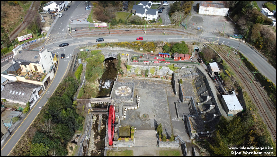 The top end of the gardens with the Manx Electric Railway curving around above the Great Laxey Mine Railway with their station, engine and carriage sheds on the ledge above the gardens and the line then going into the IOMs only railway tunnel.