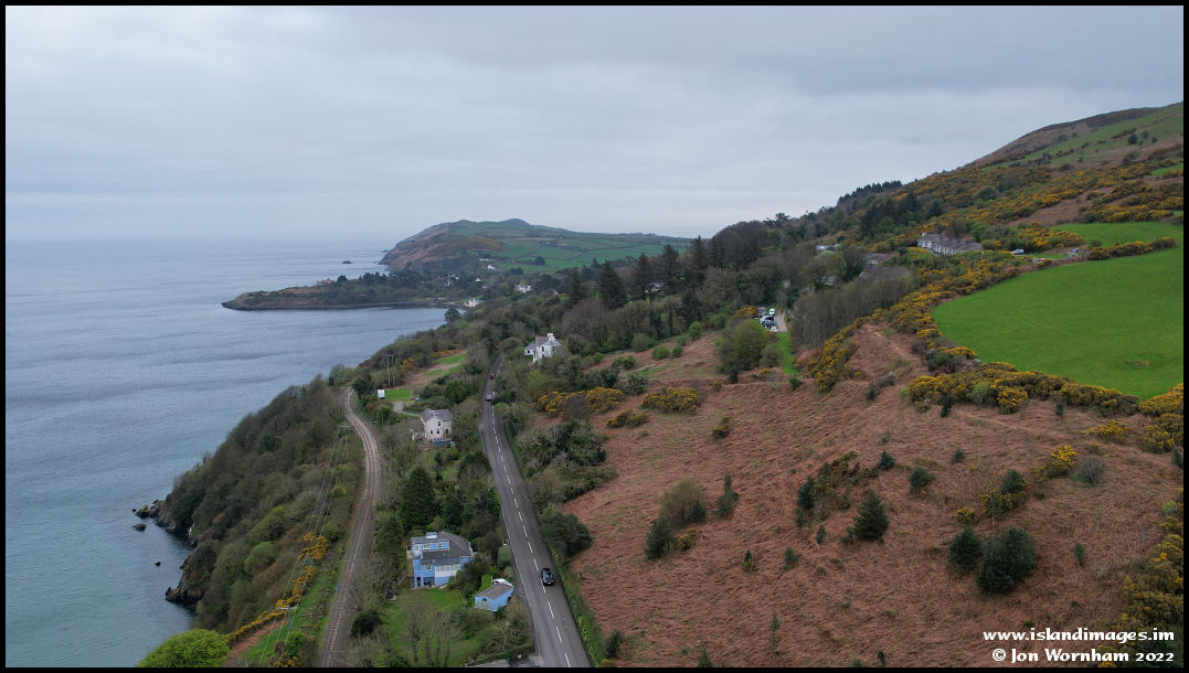 This is looking south along the coast road and Manx Electric Railway line from Ballure, with Gob-ny-Rona and Maughold Head in the background.