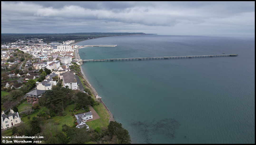 Looking along the shoreline at high tide to the Queen's Pier and harbour breakwaters. Only a tiny stretch of beach remains uncovered by the south breakwater.