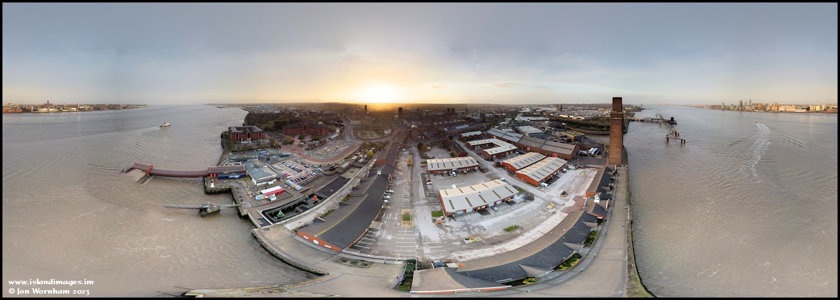 Panorama at sunset looking across Birkenhead, the River Mersey and Liverpool