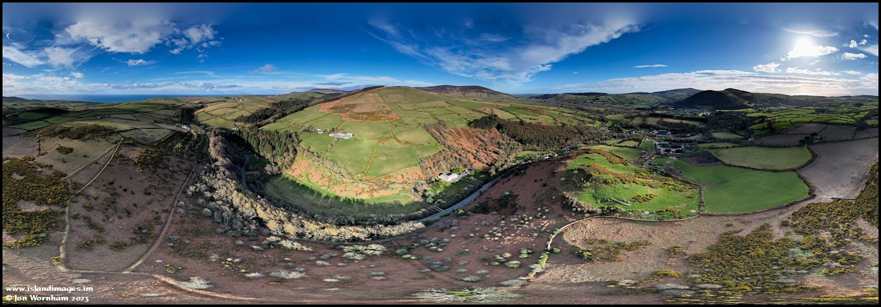 360 degree panorama centred on Beary Mountain, with the TT course running through the Glen Mooar valley between Doran's Bend and Laurel Bank.