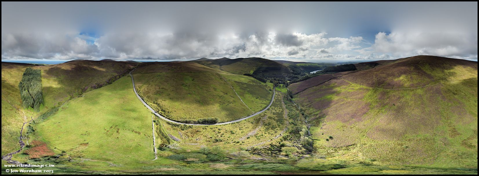 360 degree panorama at Injebreck. The old 'Governor Loch's Road' can be seen curving around the slopes of Colden.