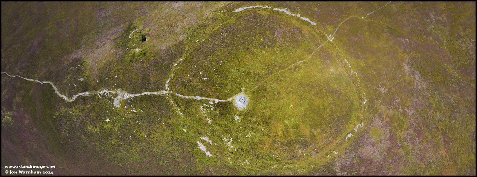 This panorama was shot from vertically above the summit and is presented to show the remains of the stone defensive wall around the settlement. Some traces of roundhouses can be seen in changes to the colour of the grass.